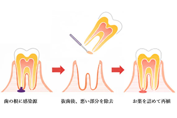 通常の根管治療では届かない感染部位に対して、歯を一度抜いてから、根の先端の病巣を取り除き、必要な処置を施したうえで再び元の場所に戻します。特に、側枝や根尖孔外感染などが原因で治癒が難しい場合に適応されます。